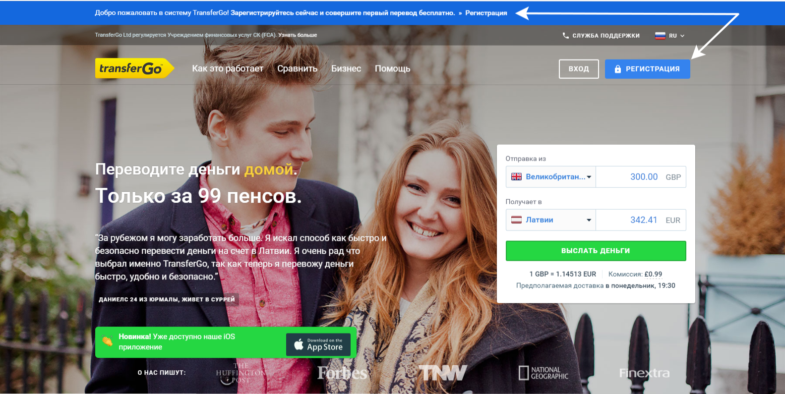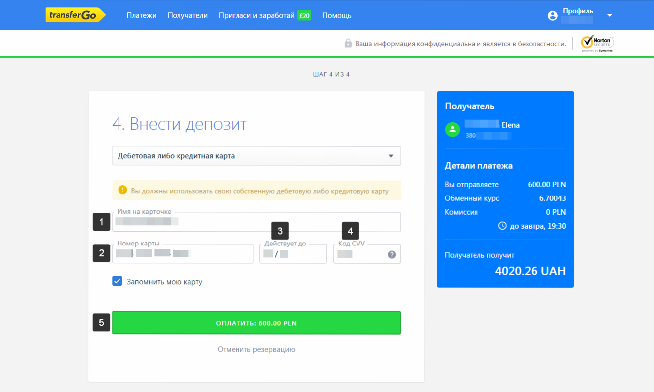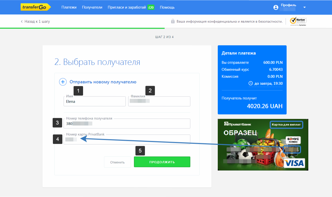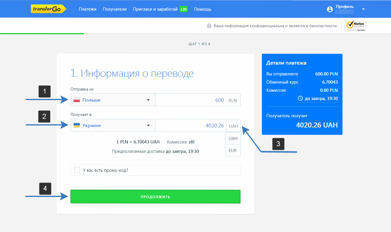 На этом процедура регистрации и отправки денег в TransferGo завершена. На электронную почту Вы дополнительно получите уведомление о статусе платежа.