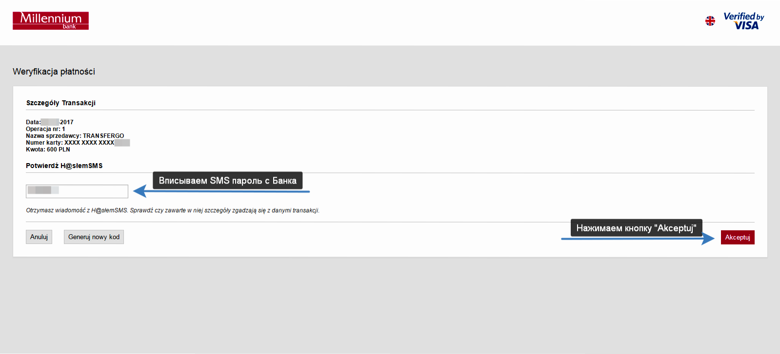 SMS пароль с банка для подтверждения оплаты. Тем самым подтверждаем платеж. На скриншоте указано окно подтверждения банка Милленниум. Изображение на экране может отличаться, если вы пользуетесь услугами другого банка: