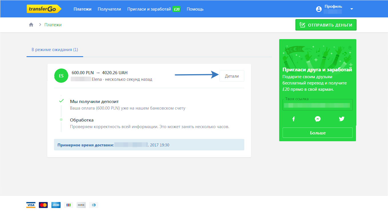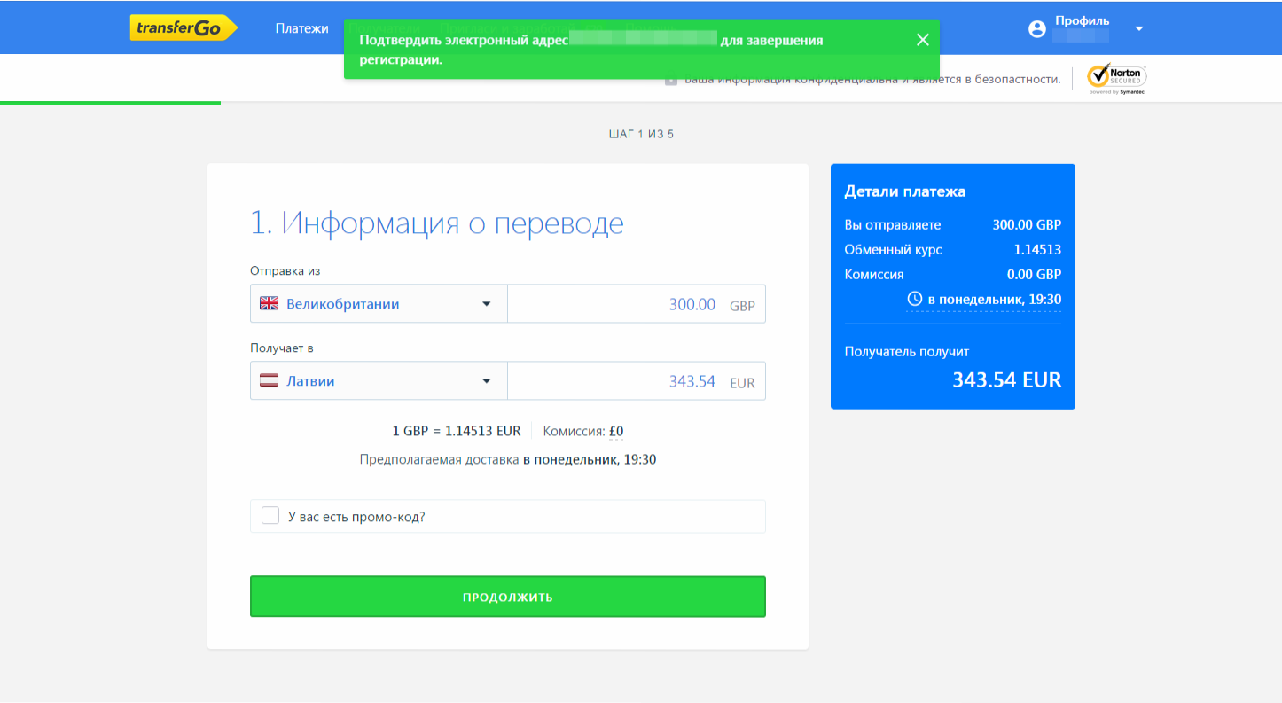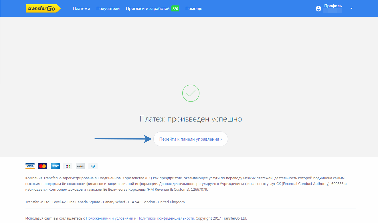 На этом процедура регистрации и отправки денег в TransferGo завершена. На электронную почту Вы дополнительно получите уведомление о статусе платежа.