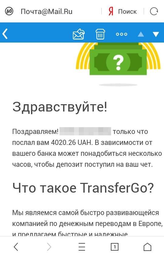 На электронную почту получателя (если ее указывали при отправлении перевода) придет сообщение от TransferGo: